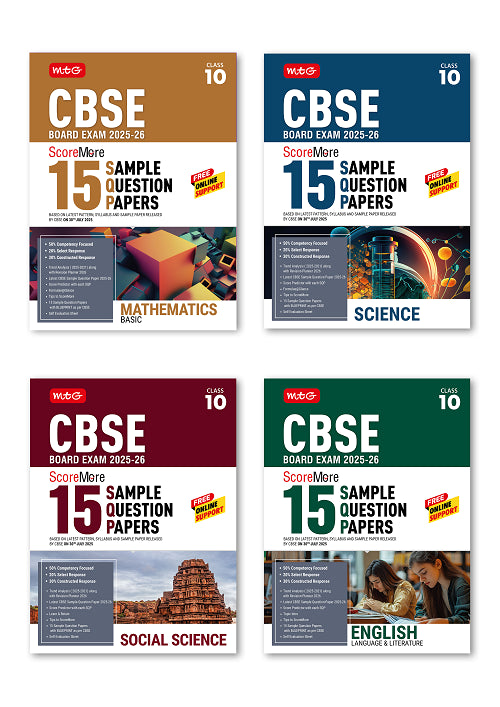 MTG presents the updated 4-in-1 combo of CBSE ScoreMore 15 Sample Papers for Class 10. This combo pack includes 15 SQPs based on the latest Sample Papers from CBSE (issued on 30th July 2025) with solutions that align with the CBSE Marking Scheme. The pack also features tips like Important Formulae, CBSE Score Predictor, and strategies to help you score better in the 2026 CBSE Board exams.